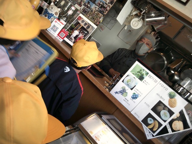 平野屋さんでは、昔のお店の様子や売っている飲み物、アイス等について聞いてきました。メニュー表を見て、気になったメニューについてさらに詳しく質問する様子も見られました。
