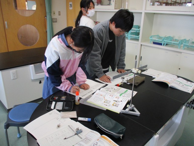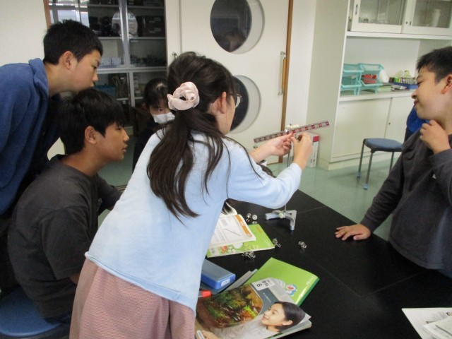 理科でてこのはたらきを学習しています。今日はてこがつりあうときのきまりを考えました。左のうでと右のうでにおもりをつけ、つりあうときを調べました。変える条件と変えない条件に気を付けて、きまりを見つけることができました。