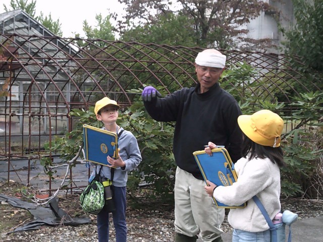 富大農園では、管理人さんから、農園内にある果実のなる木や建物について話を聞きました。お土産に渋柿をいただきました。