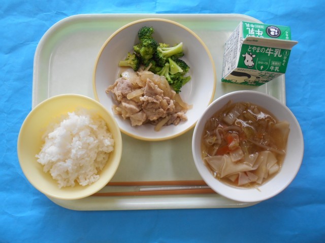 この日のメニューは、ごはん、ワンタンスープ、ゆでブロッコリー、ぶたにくのおろしいためでした。ぶたにくがだいこんおろしとからんで、おいしくいただきました。