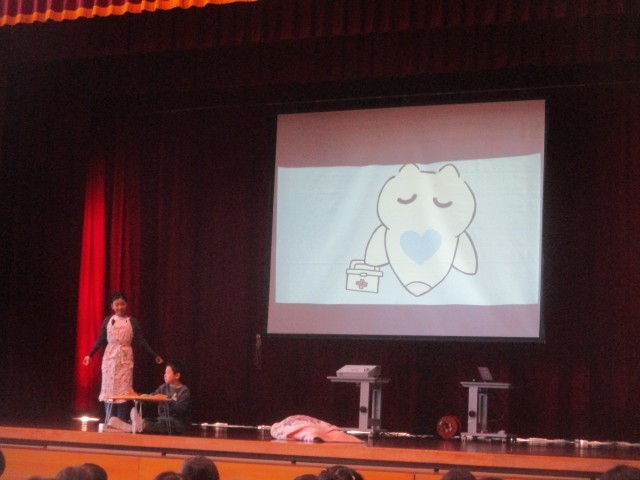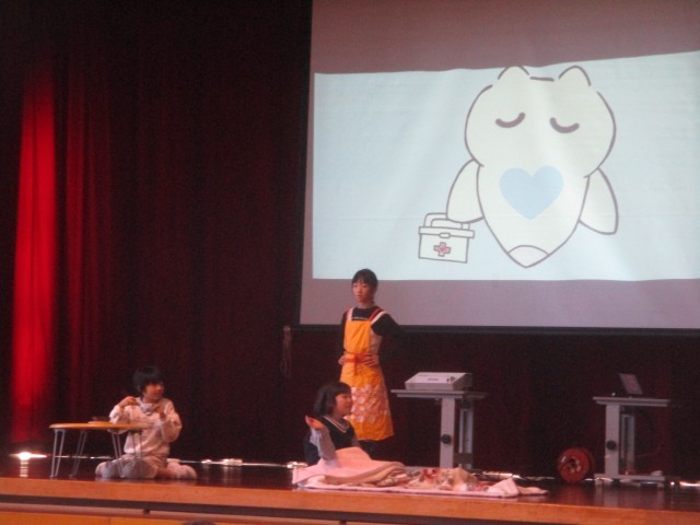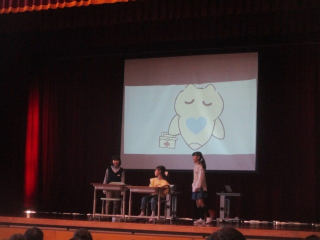 学校保健委員会では、3年生7人で劇をしました。朝ごはんにパンを1こだけ食べ、学校で体がだるくなる様子や、寝る前にゲームをして過ごし眠りにくくなる様子を演じて、栄養と睡眠の大切さを伝えました。