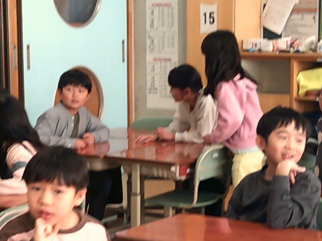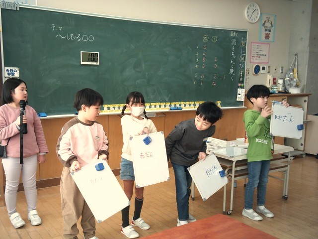 1組の学級タイムでは、生活グループ対抗で「絵あてゲーム」と「息ぴったりゲーム」を行いました。