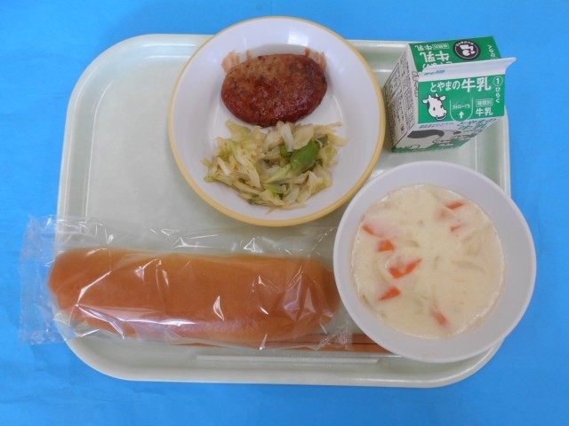 この日のメニューは、こめこパン、クリームに、やさいサラダ、ハンバーグのケチャップかけでした。こどもたちは、コッペパンにおかずをはさむなど、おいしそうにいただいていました。
