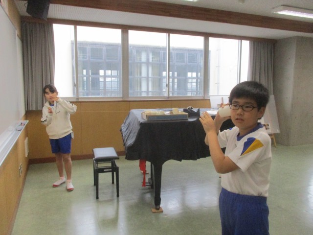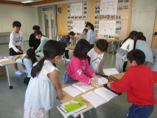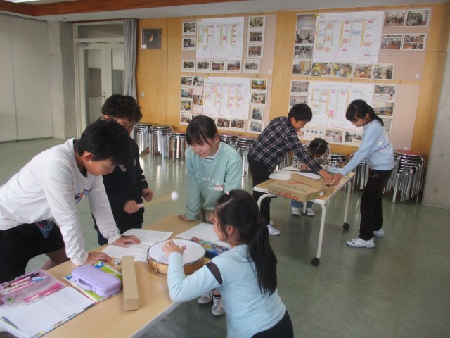 理科「音の性質」の学習では、音が出ているときの物や音を伝えるものはふるえているのか、という課題で実験しました。太鼓をたたいた時のビーズの動きや糸電話の糸のふるえを確かめました。班で協力して活動しています。