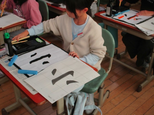 書写では、毛筆を使用して、「点」「はね」の書き方や筆圧を確かめました。これまで学習した「左払い」「右払い」との違いを意識しながら、「小」の字を丁寧に書きました。