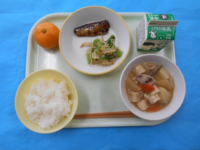 きょうのメニューは、ごはん、ぎゅうにゅう、ごまけんちん、もやしのおひたし、いわしのうめに、みかんです。ごまけんちんは、ごまのふうみをかんじながら、ごぼうなどのこんさいをいただきました。