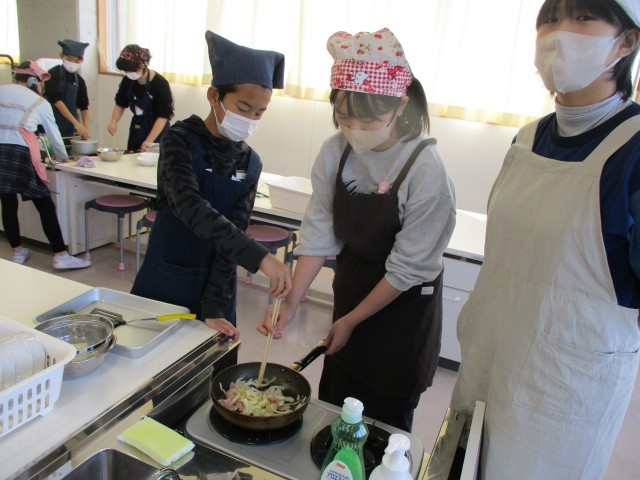家庭科では、献立をつくる学習をしています。今日はおかずをつくる調理実習を行いました。今日調理したのは「ベーコンポテト」です。これまで学習したゆでる調理、いためる調理をする料理で、グループの人と役割を分担しながら手際よくつくることができました。