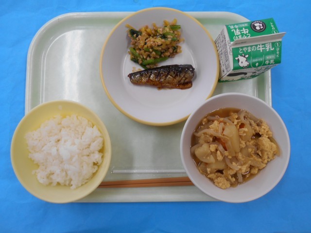このひのメニューは、ごはん、ぎゅうにゅう、たまごとじ、なっとうあえ、いわしのとさにでした。
