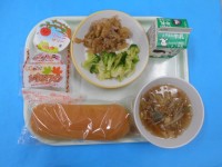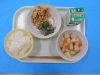 きょうのメニューは、ごはん、ぎゅうにゅう、ぶたじる、やさいいため、とりつくねです。ぶたじるには、ぶたにくとやさいのおだしがよくでており、とてもあたたまりました。