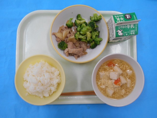 このひのメニューは、ごはん、ぎゅうにゅう、かきたまじる、ゆでブロッコリー、ぶたにくのジャンローでした。