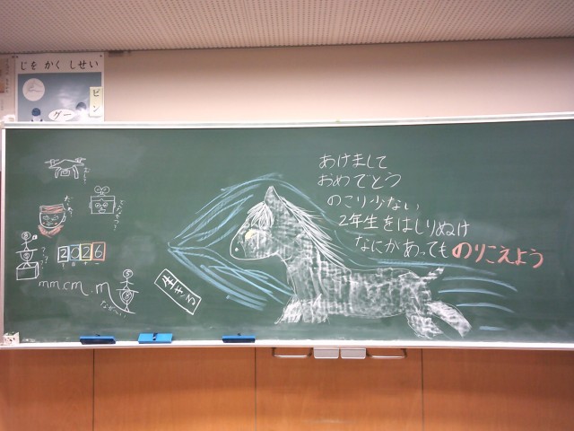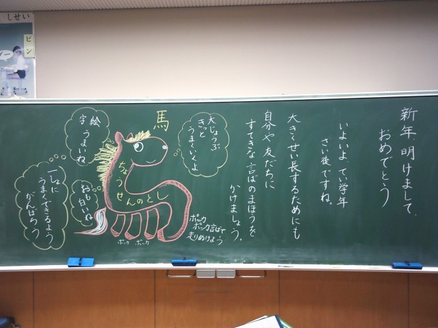 いよいよ、新年とともに低学年最後の3学期がスタートしました。教室では、子供たちと「今年の午年は挑戦する年であり、『どうせ』『(する前に)できない』という言葉ではなく、『うまくいくかも』という希望をもった気持ちでいろんなことに挑戦しよう。午に因んで、『うまいね』『きっとうまくいくよ』など、温かい言葉をかけ合っていこう。」といった話をしてスタートしました。