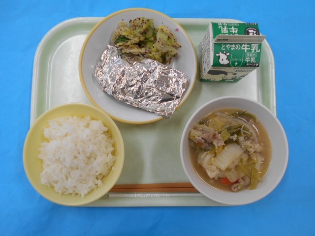 このひのメニューは、ごはん、ぎゅうにゅう、はくさいなべ、ゆかりあえ、さばのぎんがみやきでした。3がっきのきゅうしょくがはじまりました。おいしいきゅうしょくをもりもりたべましょう。