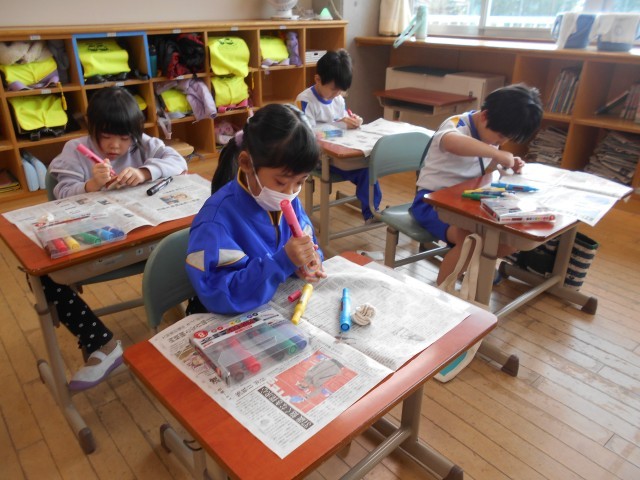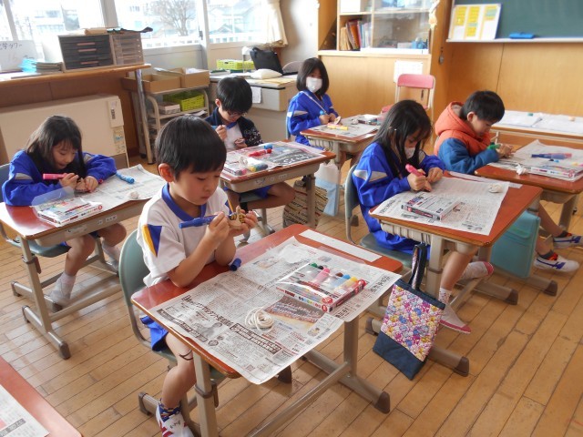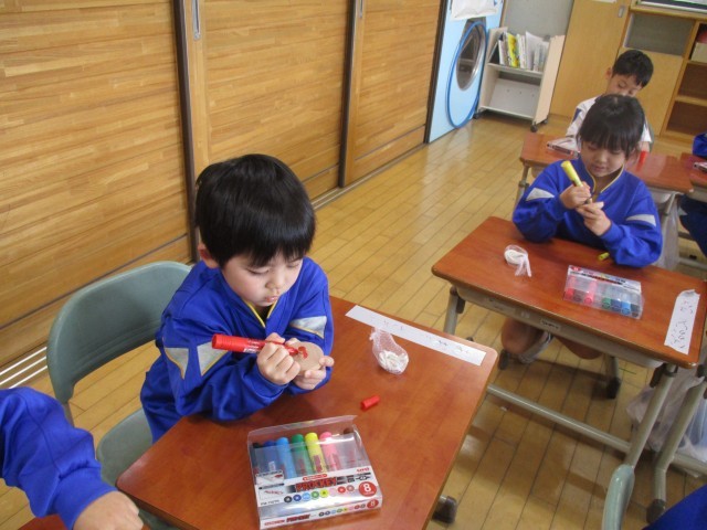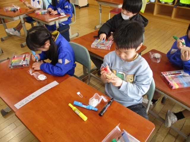 生活科の学習では、むかしのあそびについて学習しています。今日は、こまの色塗りをしました。子供たちは、好きな色を塗ったり、回った時にきれいに見えそうなデザインを考えたりしていました。これから、様々なむかしのあそびに挑戦していきます。