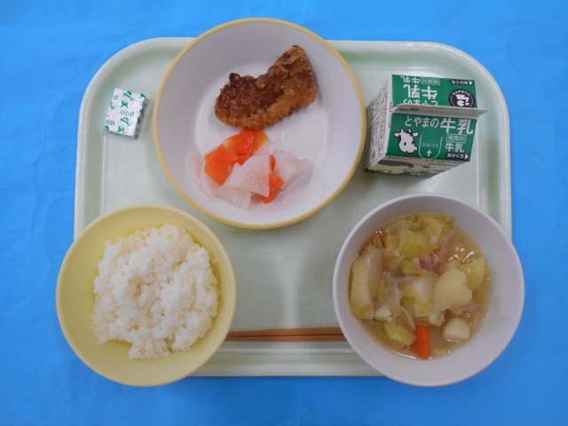 きょうのメニューは、ごはん、ぎゅうにゅう、やさいのスープに、ぶたにくのかおりあげ、ピクルス、ポケットチーズです。やさいのスープにでは、いろいろなやさいのうまみをかんじながらいただきました。