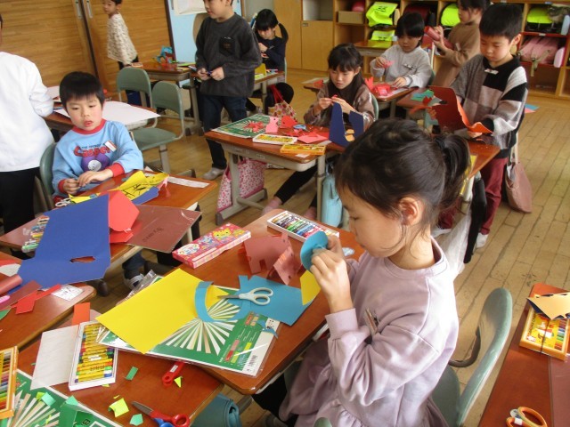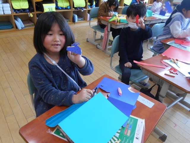 図画工作科の授業では、「おってたてたら」という学習を始めました。紙の折り方を工夫して立たせたり、切った形から動物や食べ物、建物等に見立てたりしました。次回は、土台の画用紙に色を塗ったり絵を描いたりして、思い描いた世界を作っていきます。