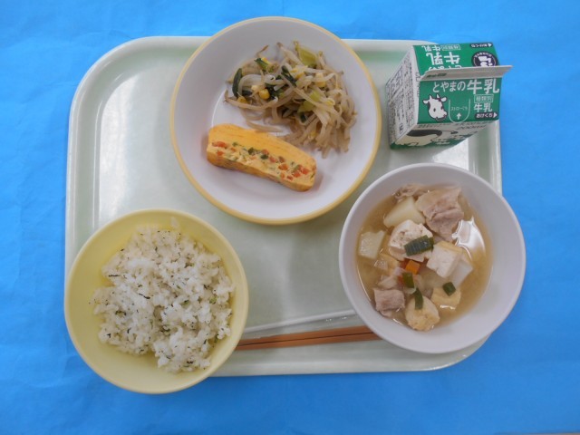 きょうのメニューは、なめし、ぎゅうにゅう、ぶたじる、ちんげんさいソテー、ちぐさやきです。ぶたじるは、しょうがふうみで、たべたあとはからだがポカポカあたたかくなりました。