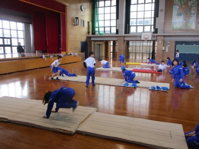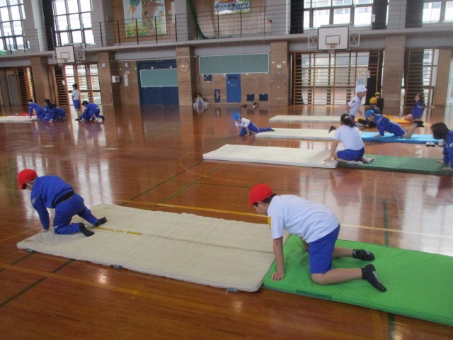 体育の学習ではマット運動をしています。あざらしやかえるの足うちなど、前転や後転、倒立につながる準備運動を真剣に行っていました。3年生のときのマット運動を思い出しながら様々な技にチャレンジしています。
