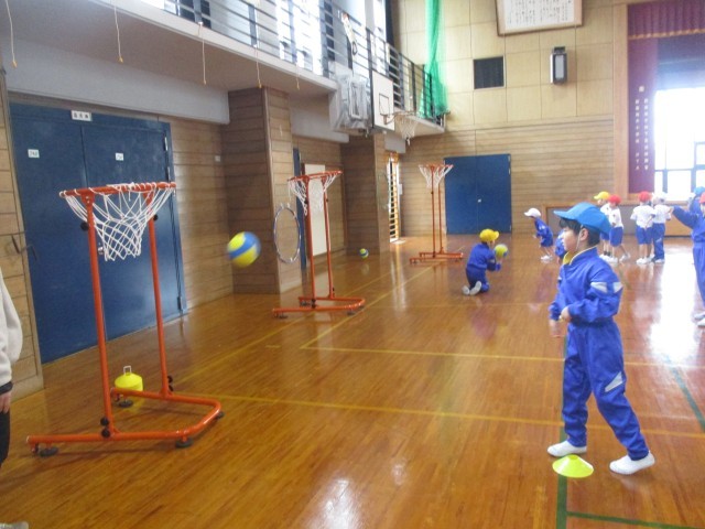 子供たちは、ボールを使った遊びを繰り返す中で、投げることに慣れ、狙いを定めて投げることができるようになってきました。これまでは教師が考えたコースで投げる練習をしていましたが、子供たちからもアイデアを募り、子供たちが考えたコースで投げる練習も行っています。様々なコースが増えてきて、練習し甲斐がありそうです。