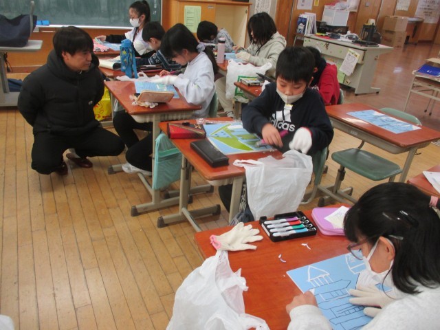 図画工作科では、版画の彫りを進めています。彫るときのポイントを聞きながら、丁寧に彫りました。