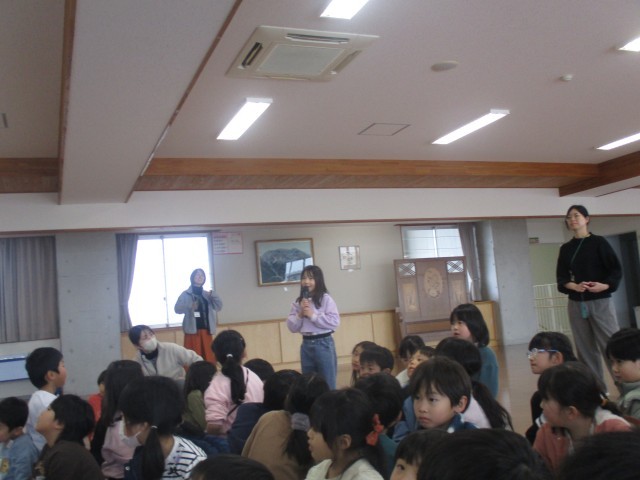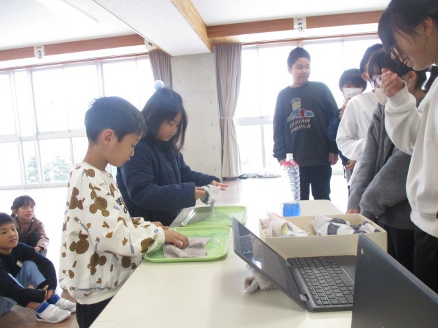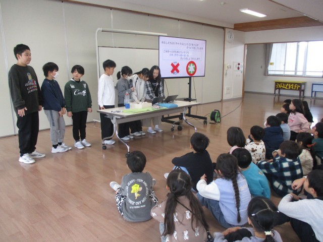 1年生は、4年生からごみ問題について発表を聞きました。ごみを減らすために、リユースやリデュースという方法があることを学び、もう着なくなった服やタオルを雑巾に作り替えることを教えてもらいました。また、実際に4年生が作ってくれた特製雑巾をプレゼントしてもらい、1年生は嬉しそうな様子でした。自分たちの生活の中でも、ごみを減らそうと意気込んでいます。