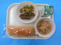 きょうのメニューは、しょくパン、ぎゅうにゅう、ほうれんそうのポタージュ、むらさきキャベツのマリネ、オムレツのトマトソースがけ、チョコペンです。きょうのテーマはずこうです。ずこうにふさわしいいろあざやかなメニューでした。