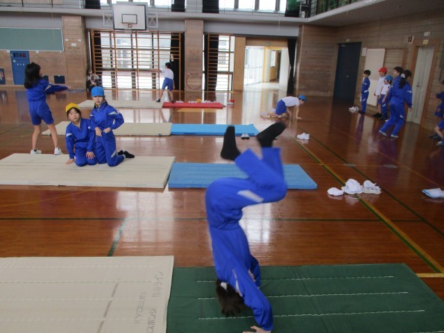 体育科の学習のマット運動では、回転技に続き倒立技の練習も行っています。回転技とは違った難しさのある倒立技に苦戦しながらも、進んで何度も挑戦している姿が見られました。上手な友達の動きをよく見ながら、自分の動きを直し、トライアンドエラーを繰り返しながらチャレンジしていました。