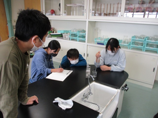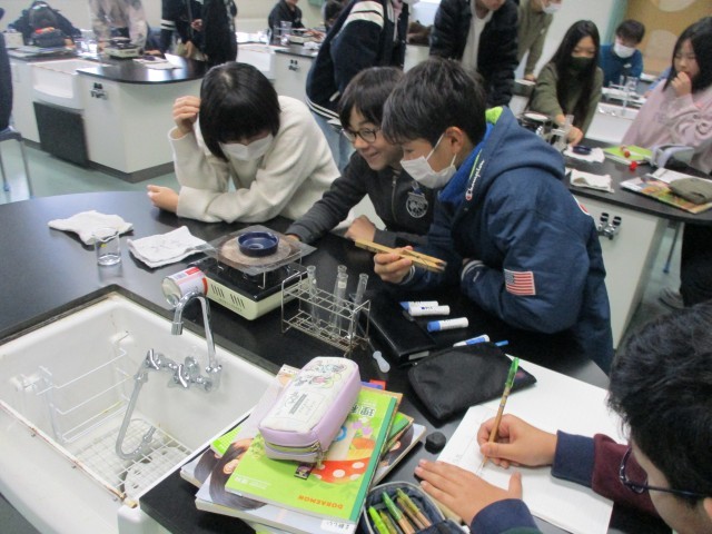 また、溶けたものがどこへ行ったのかを調べるため、金属を溶かしたうすい塩酸を熱して蒸発させました。予想通りだったことだけではなく、予想と違ったこともあり、驚いていました。