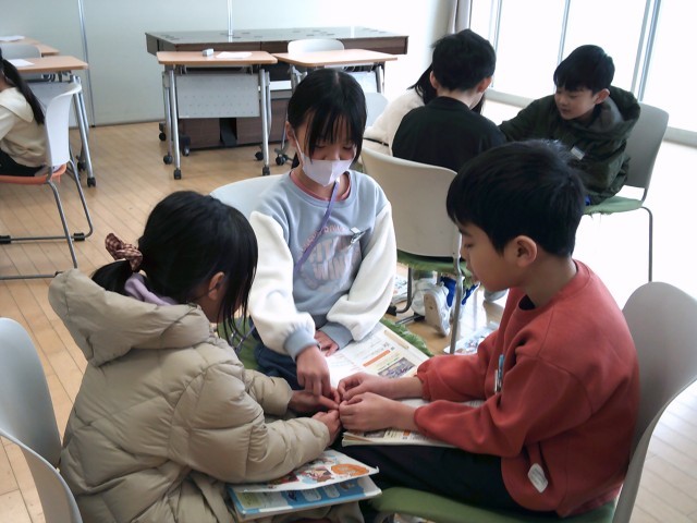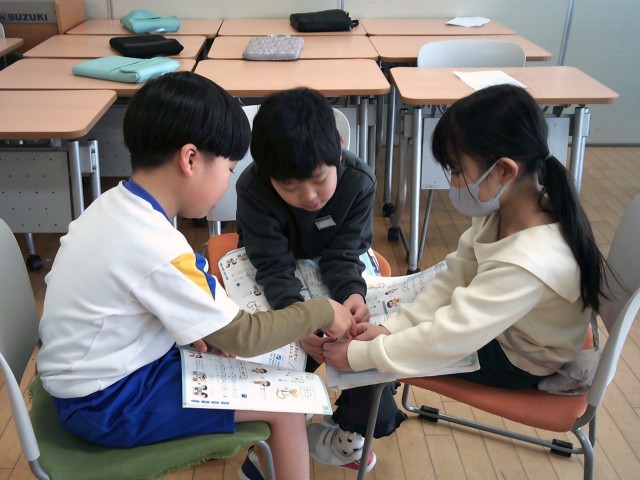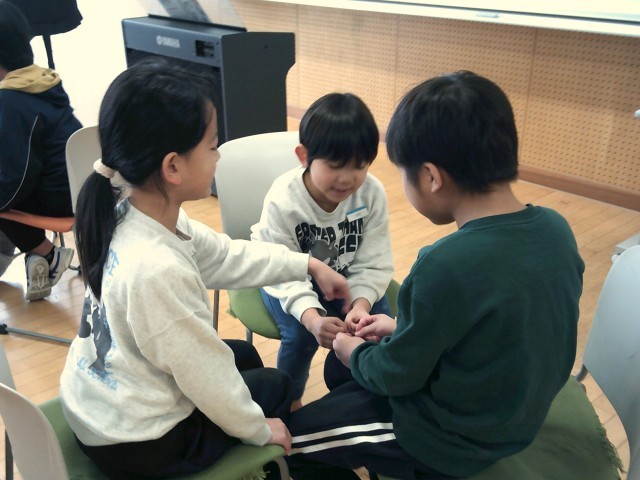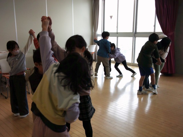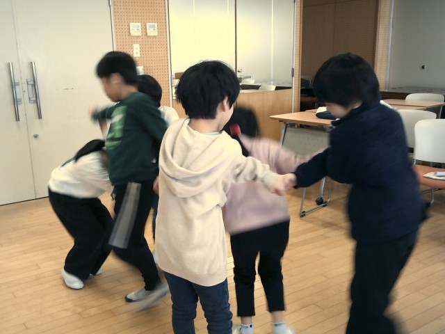 「ずいずいずっころばし」や「なべなべそこぬけ」の歌に合わせて、友達と手や体を使って遊びました。指をつかまれたり、友達と息が合わずうまく回ることができなかったりしながらも楽しんでいます。そのほかに、「小ぎつね」の曲を懸案ハーモニカで演奏する練習もしています。