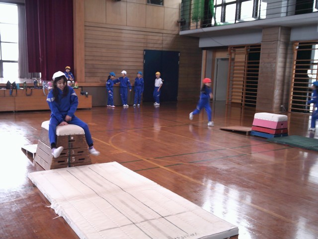 跳び箱運動では、3~5段の横と縦の跳び箱をみんなで協力し合って準備しています。自分で挑戦したい跳び箱を選んで、取り組んでいます。
