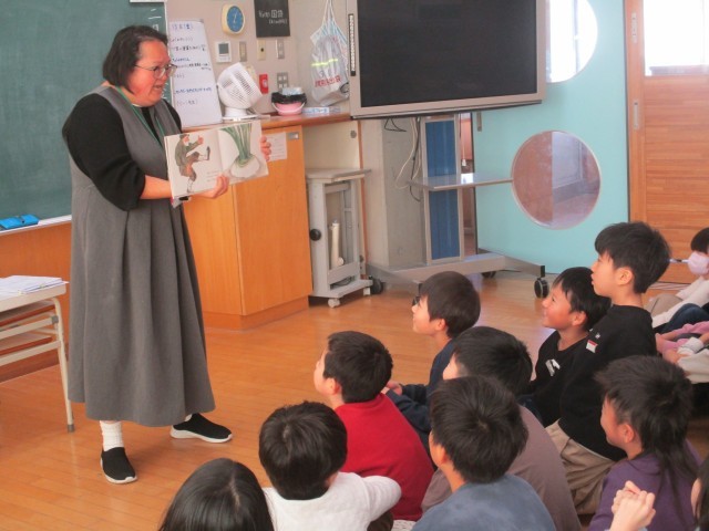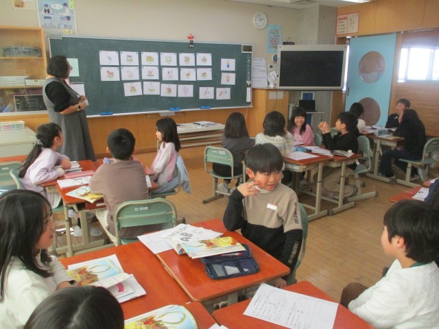 今日の外国語活動では、動物や色等を表す言葉を使ったキーワードゲームやスリーヒントゲームを通して、英語に慣れ親しみました。ALTによる絵本の読み聞かせでは、関心をもって聞いていました。