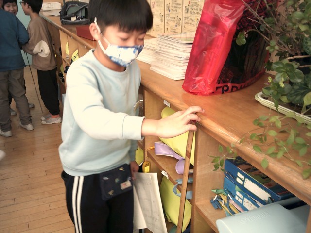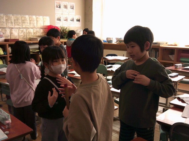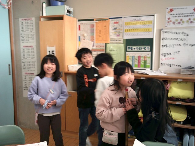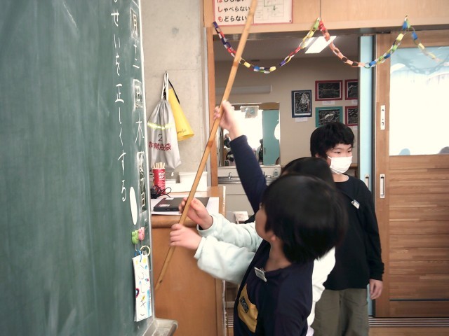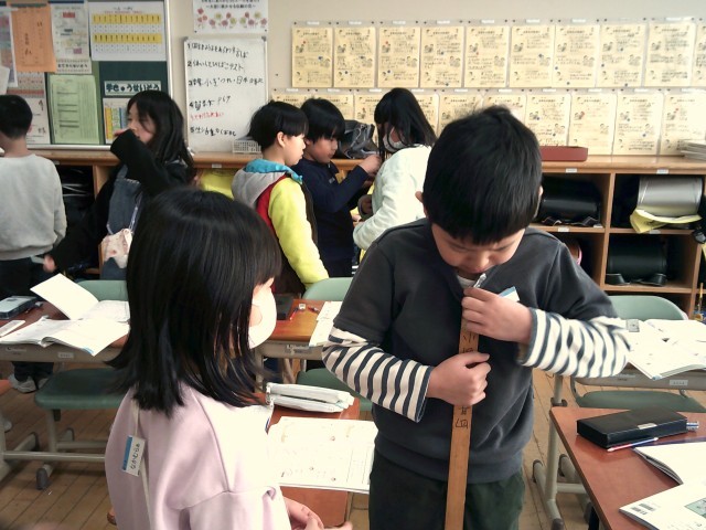 1mの感覚を知ろうと、自分の身長や教室内の1mの部分を予想立てて、友達と確かめ合いました。思っていたよりも長かったり短かったりして、「おしい!」と悔しがる声や「思っていたのと違ってた~」と意外に思う声が上がっていました。