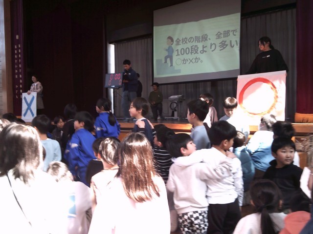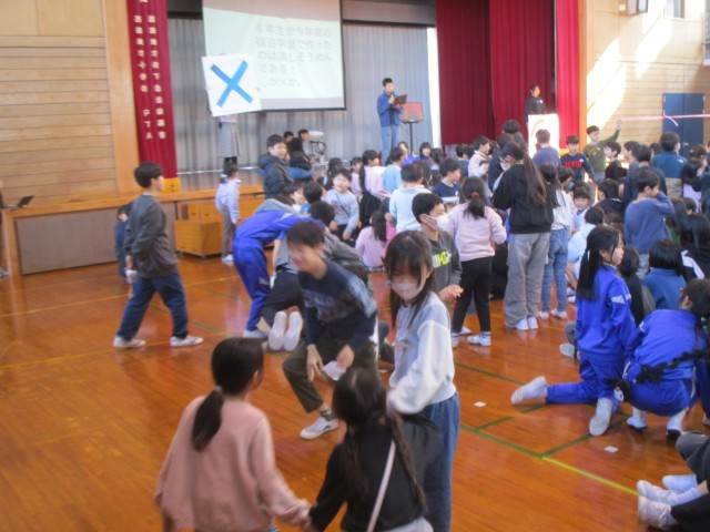 6年生の総合的な学習の取組で、縦割りで関わり合いながら仲良くなろうという目的のもと、「全校○×クイズ」が行われました。校長先生の名前クイズや6年生の担任2人によるけん玉対決結果予想クイズなど、様々なクイズで盛り上がりました。