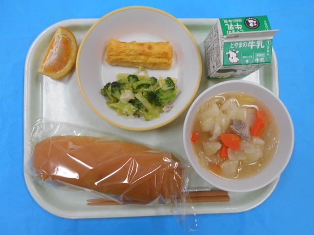 きょうのメニューは、コッペパン、ぎゅうにゅう、ポトフ、きのことブロッコリーのアヒージョ、たまごロール、いよかんです。アヒージョはにんにくのよいかおりがして、おいしくいただきました。