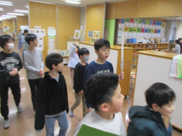 今朝の挨拶運動は2年2組の日でした。6年生と2年2組の有志で校内を挨拶して回りました。