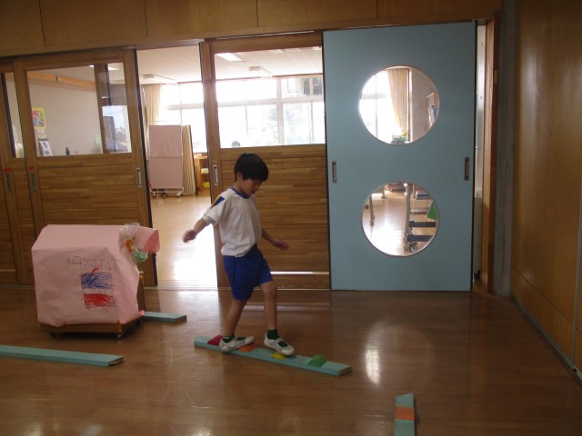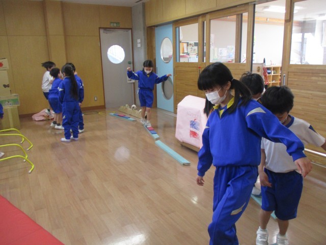2組は、「にこぽかサーキット」という身近な物で作った障害物コースに招待してもらいました。様々なコースがあり、バランスを保ったりジャンプしたりして進んでいきます。最後にはプレゼントをもらい、子供たちは体も心も、にこにこ・ぽかぽかになりました。