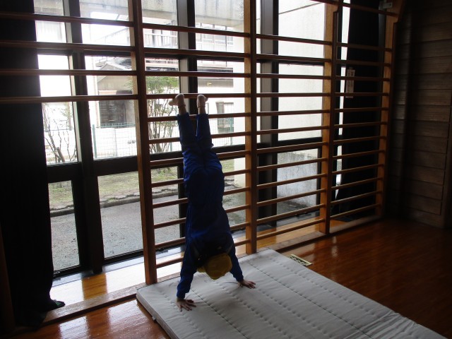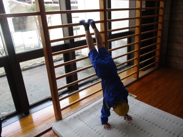 体育の時間では、倒立の練習を肋木を使って行いました。少しずつ足を上げていき、体をまっすぐ伸ばすことができました。