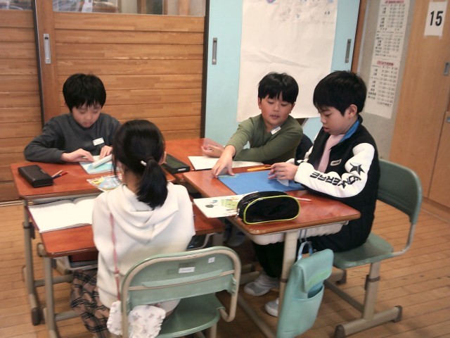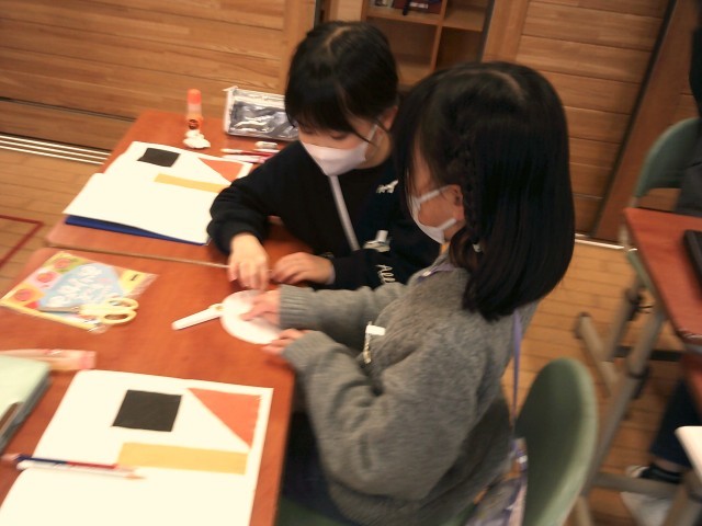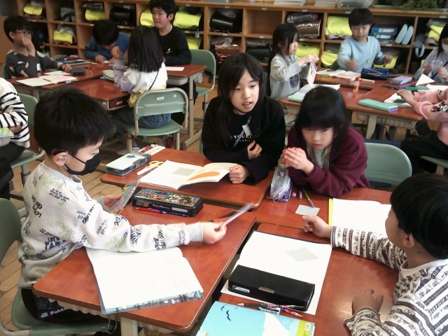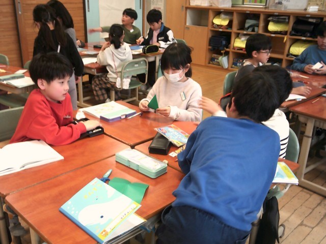 分数の学習が始まりました。折り紙を使って、二分の一や四分の一の表し方をグループで考えました。