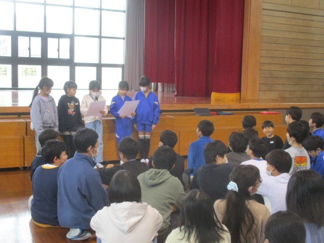 卒業を祝う会で6年生と3年生が縄跳びやダンスで対決することを伝えました。