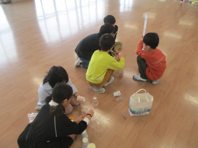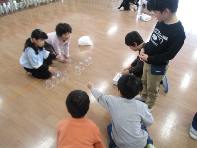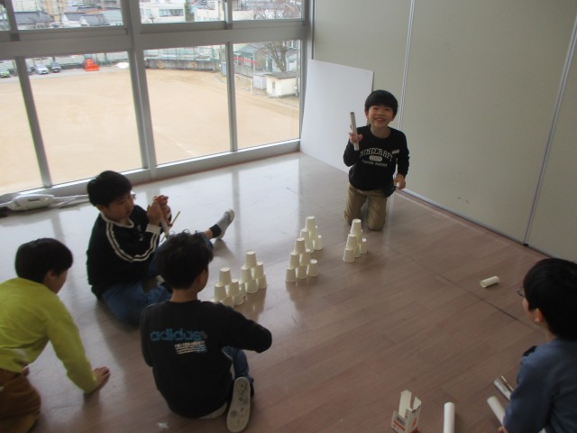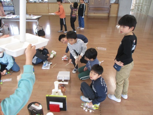 2組では、話合いの結果、「動くおもちゃ」の学習のまとめとして、クラス替え前の思い出作りとして、自分たちの作ったおもちゃを学級で楽しもうということになりました。クラスの友達とお互いのおもちゃを楽しむことができました。