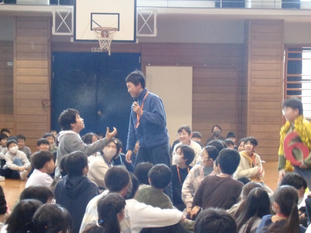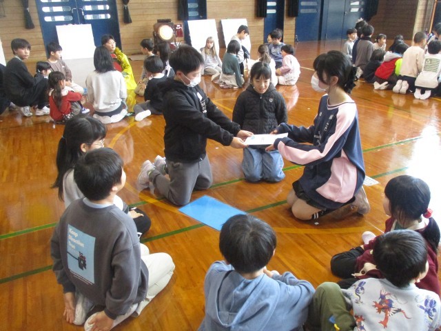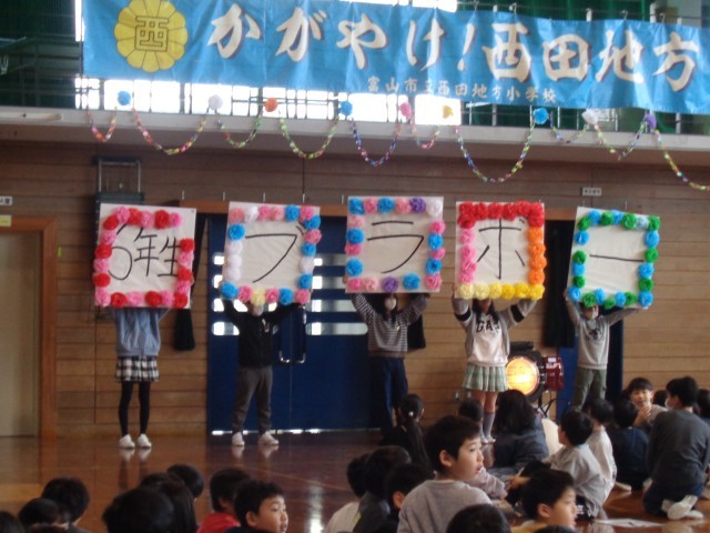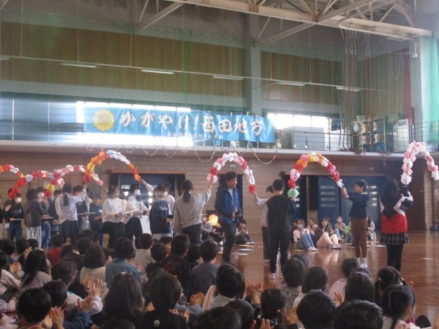 5年生企画の卒業を祝う会がありました。「6年生にありがとうとエールを送ろう~大空に咲かせる伝統の花」のスローガンのもと、各学年がすてきな出し物を披露しました。5年生も司会進行、会場の飾りつけ、劇の出し物等、これまで準備してきた成果を発揮することができました。