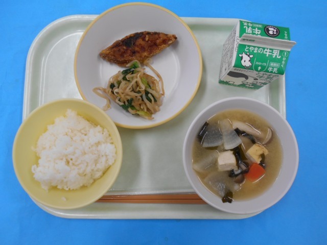 きょうのメニューは、ごはん、ぎゅうにゅう、ごもくじる、おひたし、ふくらぎのカレーあげです。ふくらぎにカレーのあじがよくあい、おいしかったです。