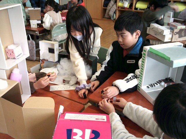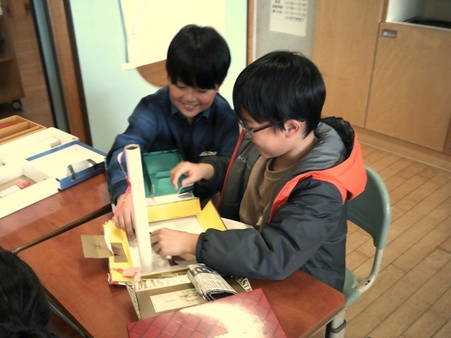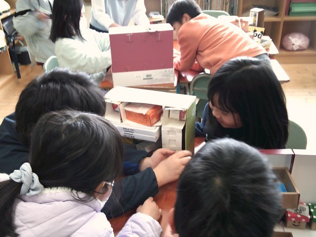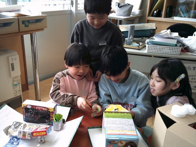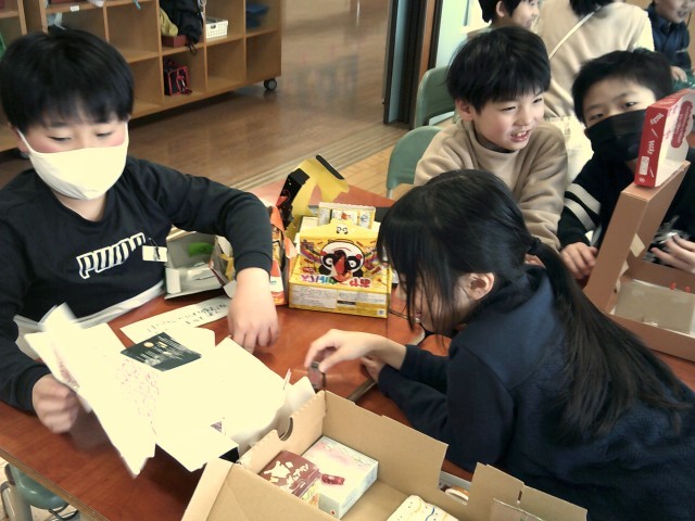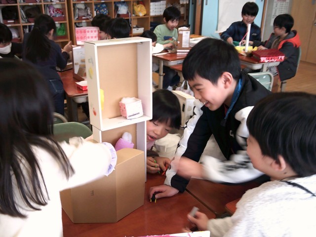 完成した「友だちハウス」を使って、みんなで鑑賞を兼ねて遊びました。子供たちは自分や友達の作った家で、「ピンポーン、遊ぼう!」と声をかけたり、「かくれんぼしよう」「この階段のぼっていい?」などと言いながら、小さな友だち(人形)遊びを楽しんでいました。振り返りでは、「どの作品も楽しくできていてよかった」「〇〇さんの作品のこんなところがよかった」など、みんなですてきなところを伝え合うことができました。