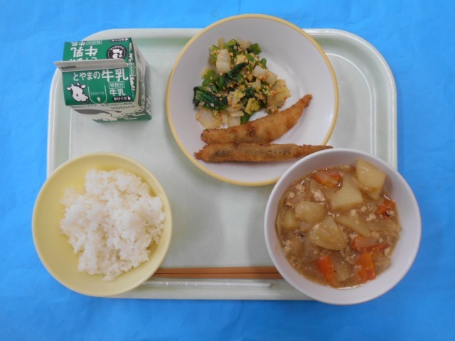 きょうのメニューは、ごはん、ぎゅうにゅう、じゃがいものそぼろに、いりだいずあえ、ししゃもフライです。そぼろには、じゃがいもにあじがよくしみて、おいしくいただきました。