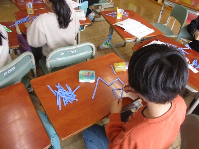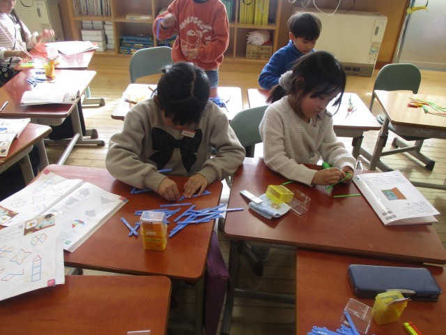 算数は「かたちづくり」の学習に入っています。今日は、かぞえぼうで色々な形を作りました。どう作ったらよいか分からない時には、友達と一緒に考えたり、ヒントを教えてあげたりして、協力しながらつくることができました。