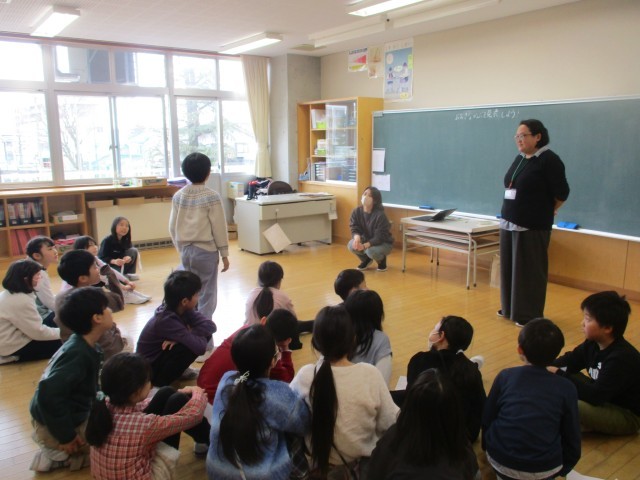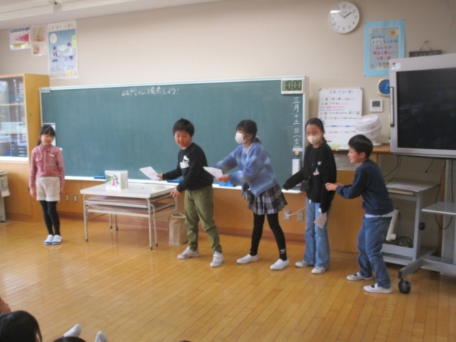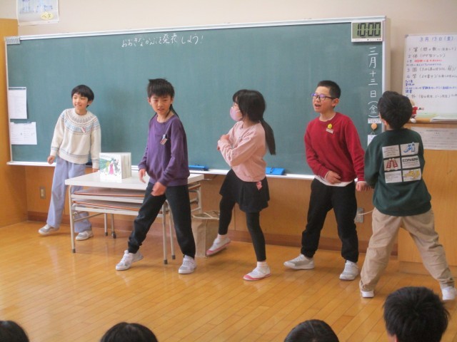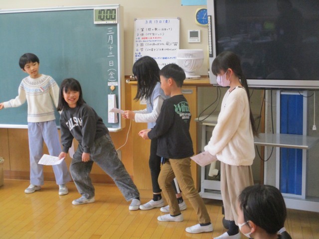 3年生最後の外国語活動では、英語劇をしました。役に合った振付をしたり、感情を込めた英語のせりふを言ったりするなど、演技をする側も見る側も楽しみながら取り組む姿が見られました。