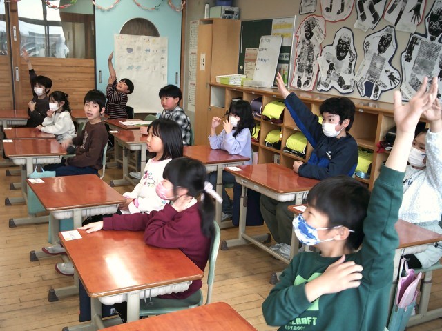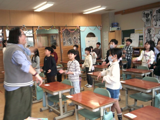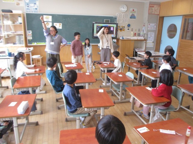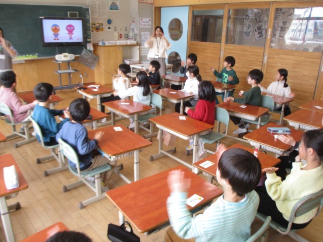 今日は外国語活動のお試しがありました。外国語活動は3年生から本格的に始まりますが、子供たちはとても楽しく活動していました。色や果物といった身近な英語を話したり、リズムに乗って英語に親しんだりしました。