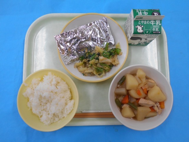 きょうのメニューは、ごはん、ぎゅうにゅう、じゃがいもととりにくのうまに、ごまあえ、さばのぎんがみやきです。きょうで、れいわ7ねんどのきゅうしょくがおわりました。どんなメニューがおいしかったか、ごかていでもはなしあってみてください。