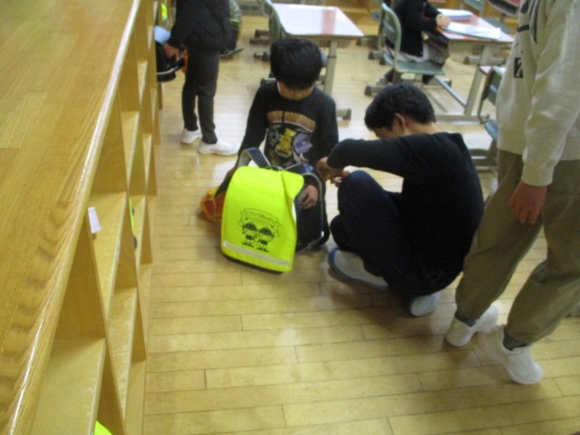 今日は新1年生の初めての登校でした。6年生は1年生に優しく声をかけながら、朝の支度の仕方を教えていました。