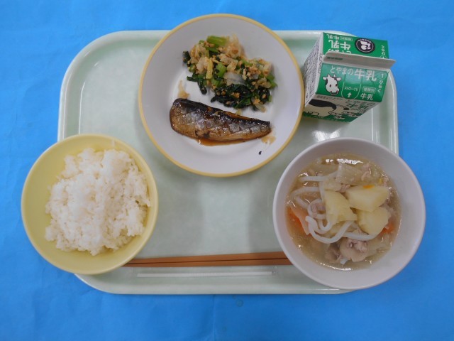 きょうのメニューは、ごはん、ぎゅうにゅう、しおにくじゃが、いりだいずあえ、いわしのうめにです。いわしは、うめあじでさっぱりといただきました。