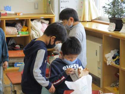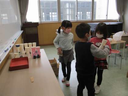 「秋を使っておもちゃをつくろう」の学習をしています。来週はいよいよ、完成したおもちゃを友達と楽しむ「秋のおもちゃランド」です。みんなが楽しいと感じられるように、各々に工夫を凝らしています。